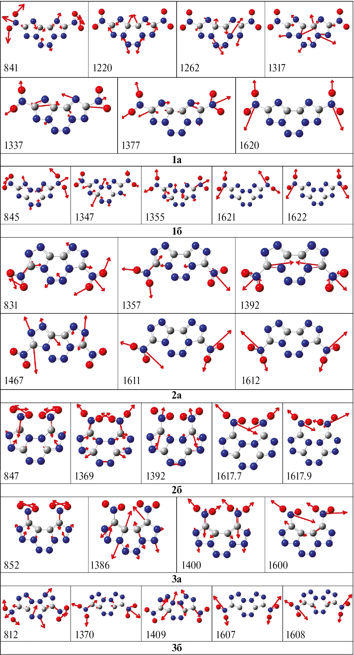 На рис. 4 и 5 представлены ИК-спектры поглощения и смещения атомов для наиболее интенсивных колебаний молекул изучаемых изомерных структур 1а,б–3а,б, рассчитанные методом B3LYP/6-311+G(2d,p). Согласно данным, приведенным на рис. 4 и 5, для структуры 1а характерны деформационные колебания N–O-связей нитрогрупп NO2 при 841 см–1, колебания N–N-связей тетразинового кольца в области 1220–1262 см–1, колебания N–N-связей триазольных колец при 1317 см–1; колебания C–N-связей в области 1337–1377 см–1 и колебания N–O-связей нитрогрупп при 1620 см–1. Для структуры 1б характерны деформационные колебания N–O-связей фрагментов NO2 при 845 см–1, колебания C–N-связей в области 1347–1355 см–1 и колебания N–O-связей в при 1621 см–1.