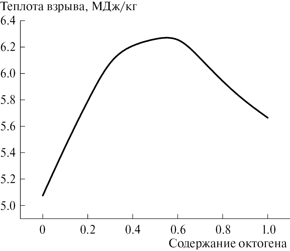 На рис. 1 приведены результаты расчетов ТВ композиций октоген — соединение VI различного состава, а на рис. 2 — данные по МС тех же композиций, а также алюминизированного состава (содержание алюминия — 12.5% вес. %, размер частиц 7 мкм). Из полученных результатов видно, что кривые зависимостей проходят через максимальные значения, которые превышают величины ТВ и МС как самого соединения VI, так и октогена. Более того, максимальное значение ТВ бинарной смеси превосходит таковое для CL-20. Оптимальная по ТВ и МС концентрация октогена близка к 60%. Из рис. 2 также видно, что введение алюминия в бинарную композицию заметно повышает МС. В целом же можно сделать вывод, что максимальное значение МС алюминизированного состава октоген — соединение VI соответствует уровню таких мощных ВВ, как гексанитробензол и бис(дифтор-аминодинитроэтил)нитрамин.