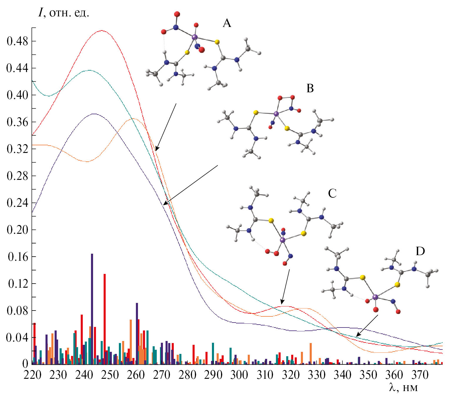 Ранее с помощью метода квантовохимического моделирования был получен ряд кислородсодержащих НКЖ, являющихся продуктами координации кислорода по различным положениям в исходном комплексе 1 [33]. На рис. 2 приведены теоретические TDDFT-спектры продуктов, имеющих полосы в диапазоне 280–350 нм. Лучше всего с экспериментальным спектром (рис. 1) совпадает теоретический спектр комплекса D ‒ Fe(NO)(O)2(SC(NHCH3)2)2, поэтому можно предположить, что он будет основным продуктом взаимодействия кислорода с исходным комплексом 1.