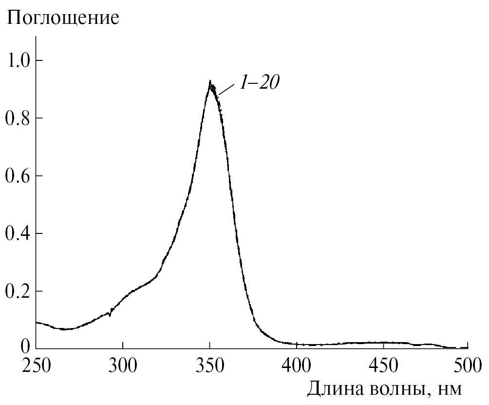 Рис. 2. Электронные спектры поглощения комплексного аниона I3– (λmax = 351 нм) в образцах верескового меда 1–20.