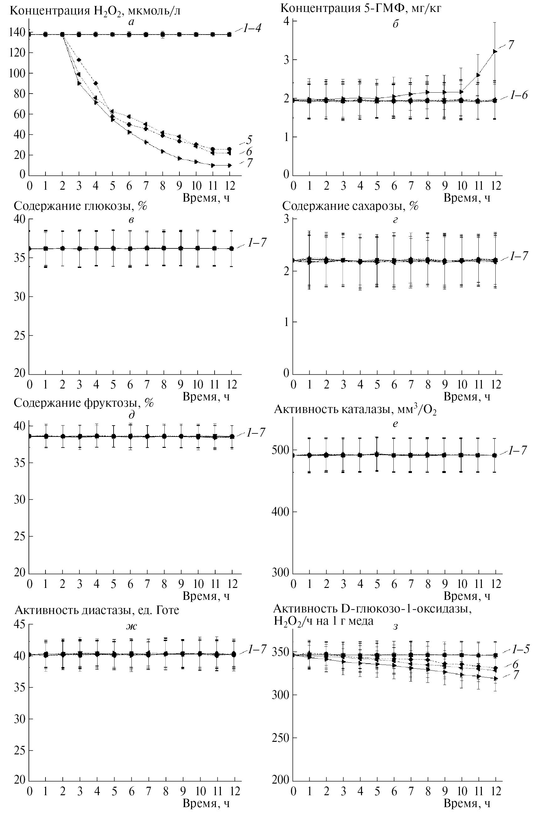 Рис. 3. Изменения химического состава образцов верескового меда: концентрации H2O2 (а), концентрации 5-ГМФ (б), содержания глюкозы (в), содержания сахарозы (г), содержания фруктозы (д), активности каталазы (е), активности диастазы (ж), активности D-глюкозо-1-оксидазы (з) без термического воздействия — контроль (необработанный мед) (1), и при воздействии в течение 12 ч температур 35 °С (2), 36 °С (3), 37 °С (4), 38 °С (5), 39 °С (6), 40 °С (7).