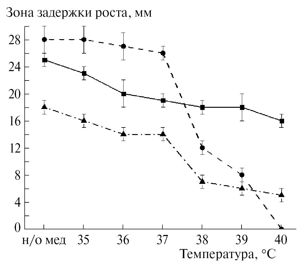 Рис. 4. Ингибирование роста бактерий E. coli (■), S. aureus (●) и B. cereus (▲) при воздействии необработанного (н/о мед) и термообработанного меда в течение 3 ч в интервале температур 35–40 °С.