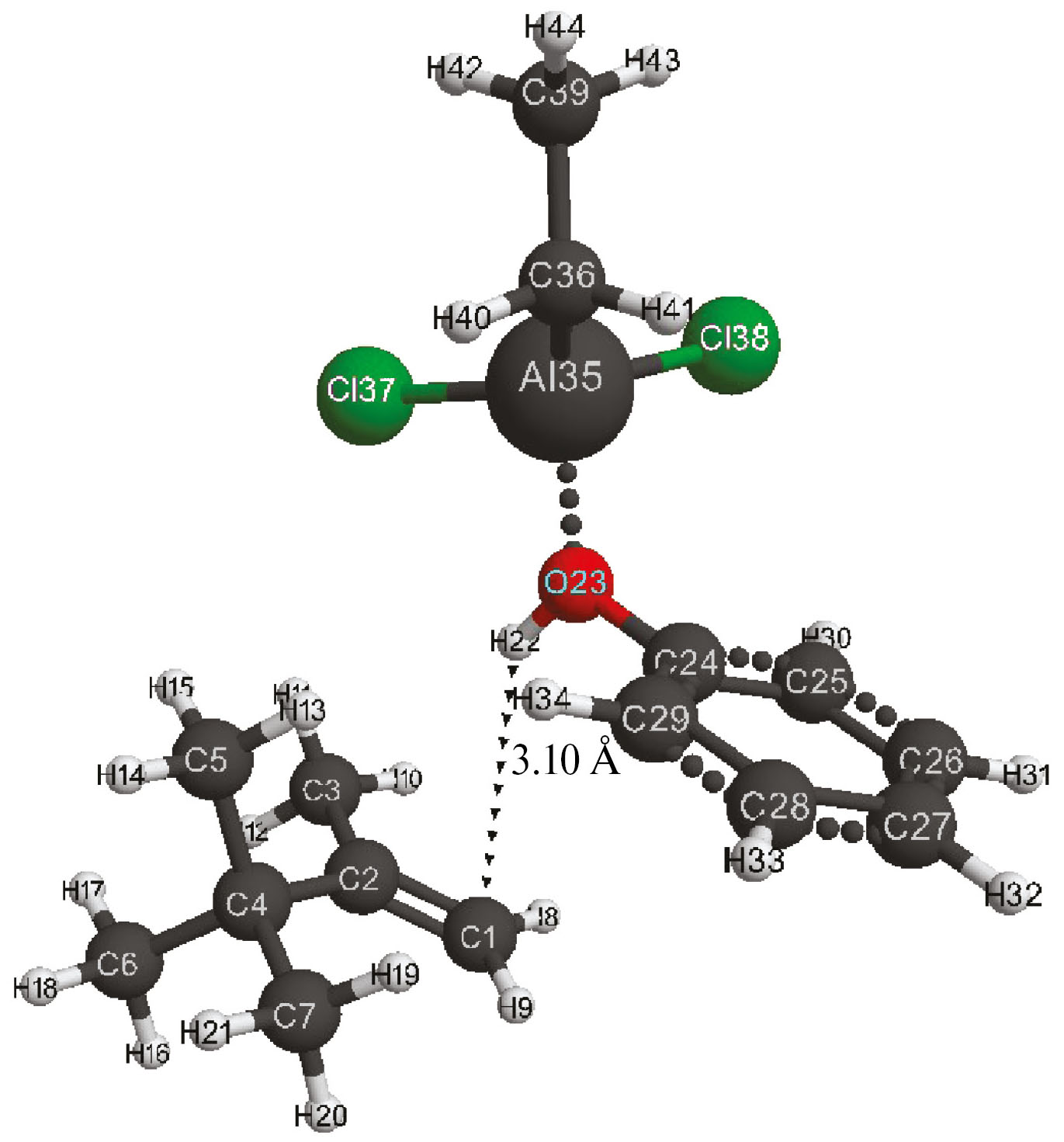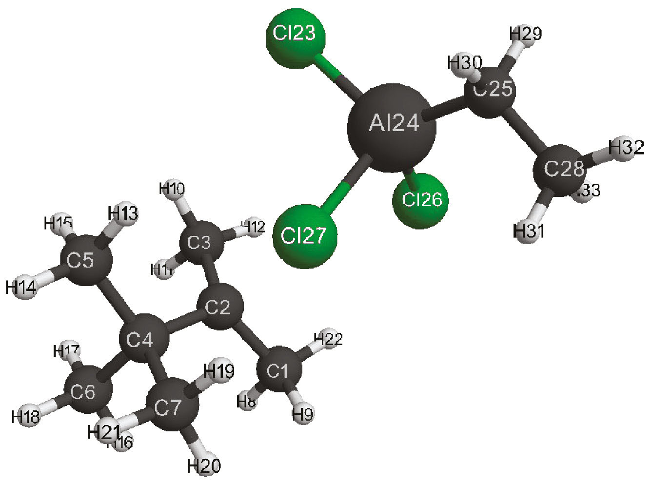 Рис. 7. Структура исходной модели комплексного катализатора AlCl2C2H5–соляная кислота (Cα) с 2,3,3-триметилбутеном-1.