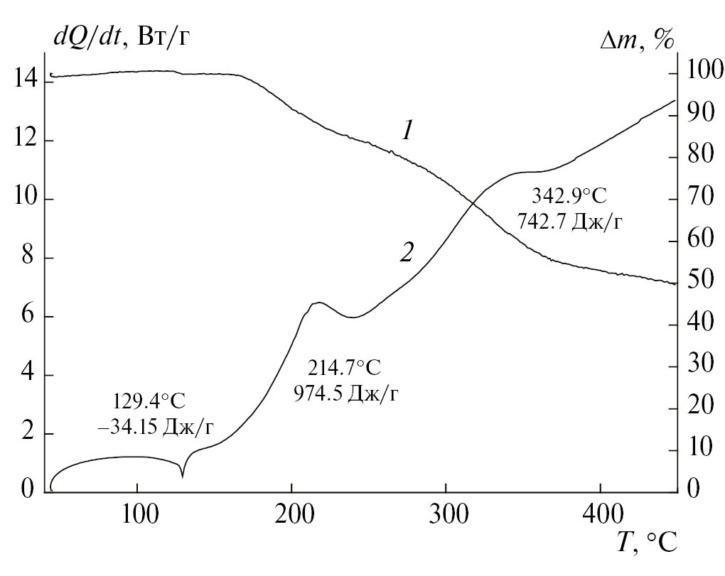 Рис. 1. Кривые ТГ(1) и ДСК (2) при термическом разложении AzPrg. Масса навески ~2 мг, скорость нагрева – 5 K/мин, скорость продувки аргоном – 40 мл/мин.