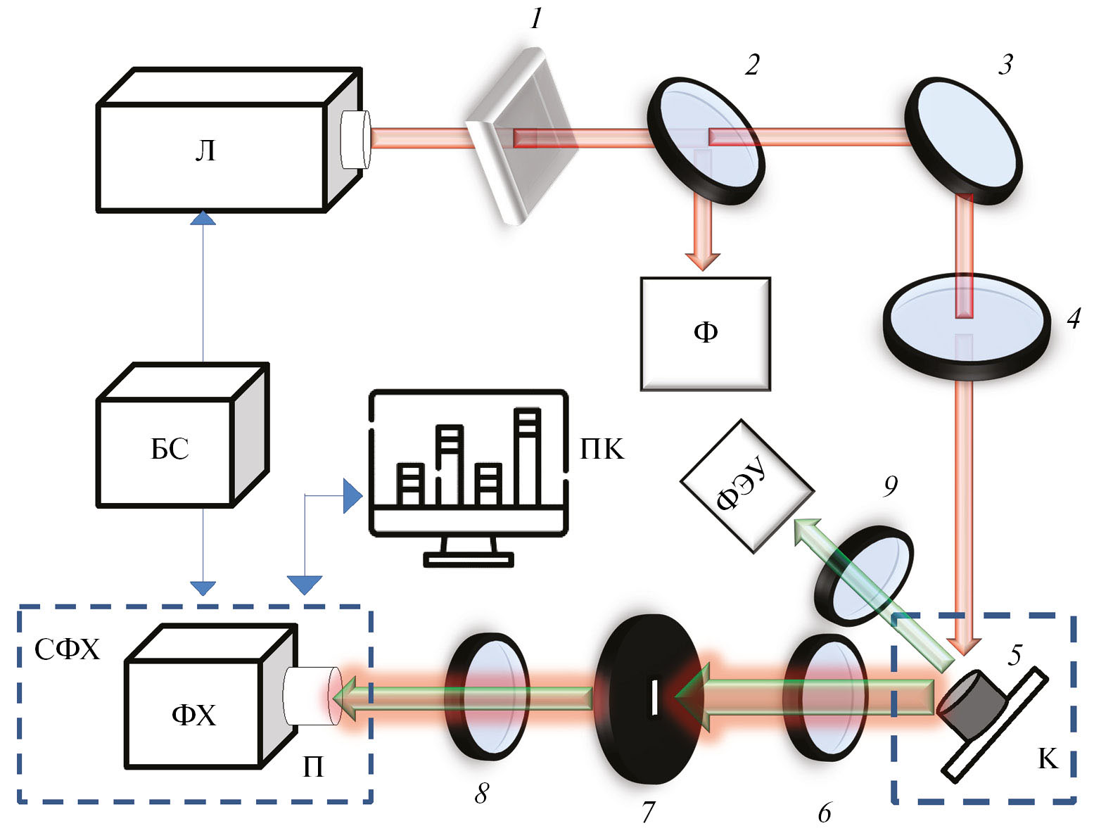 Рис. 1. Функциональная схема экспериментальной установки: 1 – нейтральные светофильтры; 2 – светоделительная пластина; 3 – поворотное зеркало; 4 – линза (F = 25 см); 5 – экспериментальная сборка с образцом; 6, 8, 9 – линзы (F = 10 см); 7 – спектрально-временная щель; Л – импульсный Nd:YAG-лазер, Ф – фотодиод, ФХ – фотохронограф, П – полихроматор, СФХ – спектрофотохронограф “ВЗГЛЯД-2А”, БС – блок синхронизации, ПК – персональный компьютер, ФЭУ – фотоэлектронный умножитель, К – экспериментальная камера.