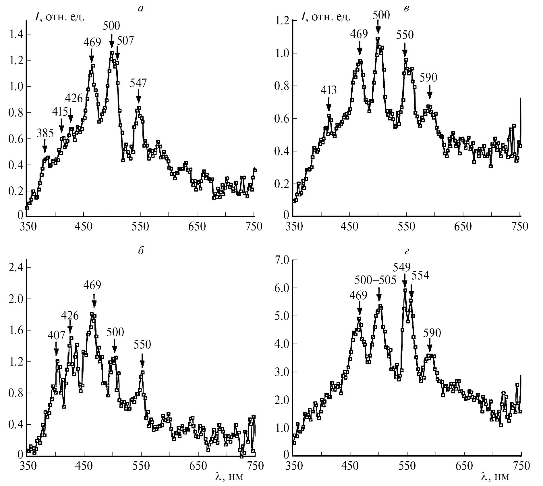 Рис. 6. Спектры свечения образцов в момент времени 100 нс от начала лазерного импульса следующих марок угля: а – ДГ, б – Г, в – Ж, г – К