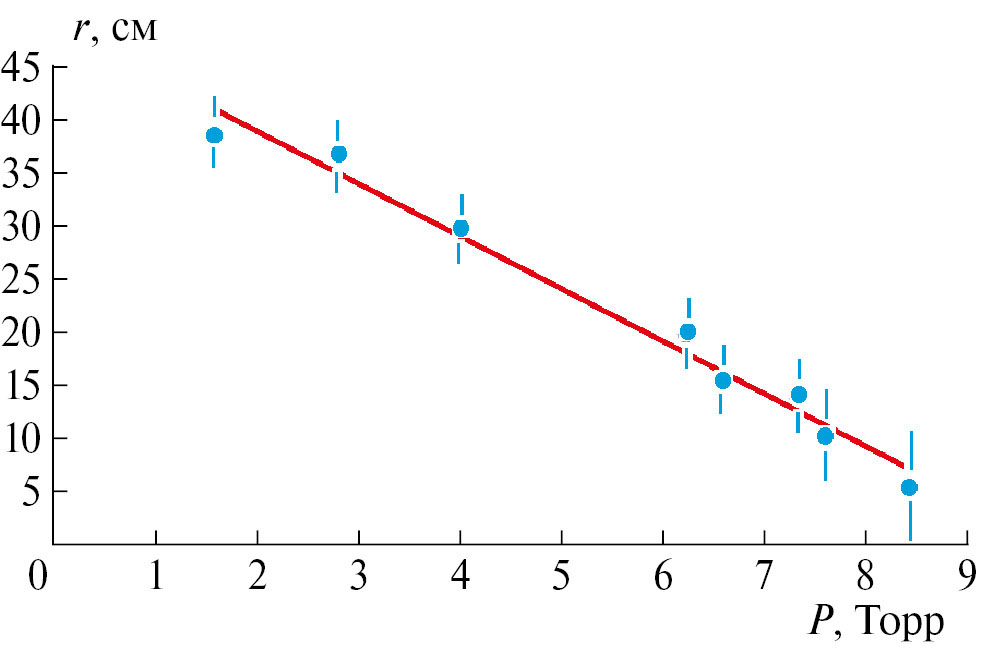 На рис. 2 представлена для примера экспериментальная зависимость радиуса r области свечения возбужденных химической реакцией атомов Mg от давления p частично диссоциированного водорода. Линейный характер, приведенной на рис. 2 зависимости r от p сложно объяснить без знания реального распределения температуры внутри реактора, а также особенности термодиффузии активных частиц в нем. И все это усложнено конвекционными процессами в газовой среде реактора.