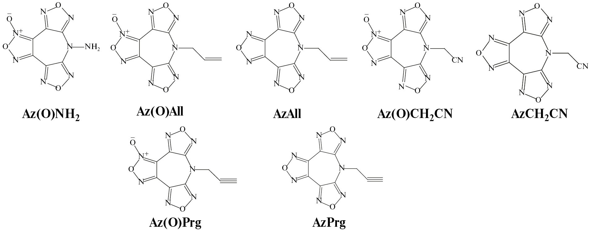 Изучение термической стабильности энергоемких веществ – одна из основных задач в изучении их свойств. Описаны закономерности термораспада ряда производных дифуразанофуроксаноазепинов и трифуразаноазепинов с различными N-заместителями. В частности, в работах [10, 14–16] изучена кинетика тепловыделения в реакциях термического разложения соединений 7-амин-7Н-дифуразано[3,4-b:3′,4′-f]фуроксано[3″,4″-d]азепина (Az(O)NH2), 7-аллил-7Н-дифуразано[3,4-b:3′,4′-f]фуроксано[3″,4″-d]азепина (Az(O)All), 7-аллил-7Н-трифуразано[3,4-b:3′,4′-d:3″,4″-f]азепина (AzAll), 7-цианометил-7Н-дифуразано[3,4-b:3’,4’-f ]фуроксано[3″,4″-d]азепина (Az(O)CH2CN), 7-цианометил-7Н-трифуразано[3,4-b:3′,4′-d:3″,4″-f]азепина (AzCH2CN), 7-пропаргил-7Н-дифуразано[3,4-b:3′,4′-f]фуроксано[3″,4″-d]азепина (Az(O)Prg) и 7-пропаргил-7Н-трифуразано[3,4-b:3′,4′-d:3″,4″-f ]азепина (AzPrg) (рис. 1) и установлена связь термической стабильности исследуемых соединений со строением их молекул. Недавно была исследована кристаллическая структура, определена экспериментальная энтальпия образования и на основе этих данных оценена энергоэффективность 7-метил-7Н-дифуразано[3,4-b:3′,4′-f]фуроксано[3″,4″-d]азепина (Az(O)CH3) и 7-метил-7Н-трифуразано[3,4-b:3′,4′-d:3″,4″-f]азепина (AzCH3) [17]: