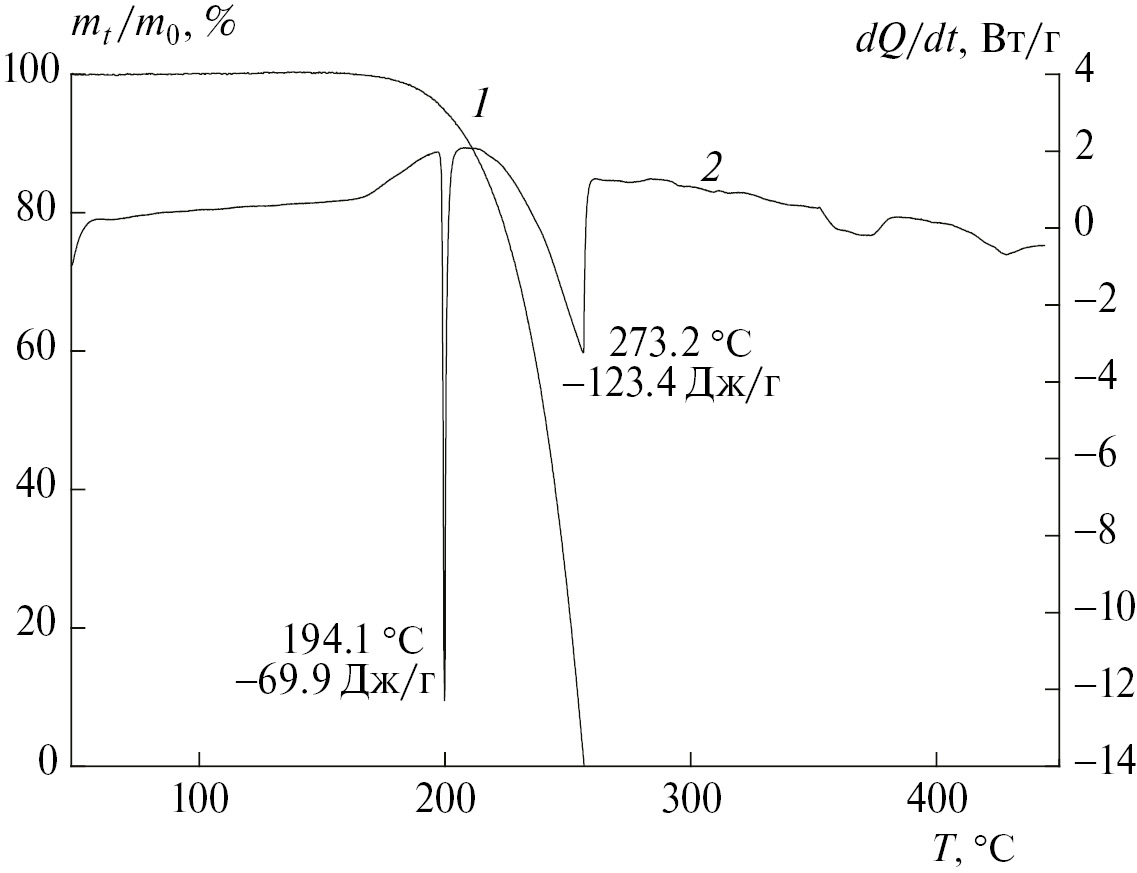 Рис. 4. Кривые ТГ (1) и ДСК (2) при термическом разложении Az(O)CH3. Масса навески ~2 мг, скорость нагрева – 5 K/мин, скорость продувки аргоном – 40 мл/мин.