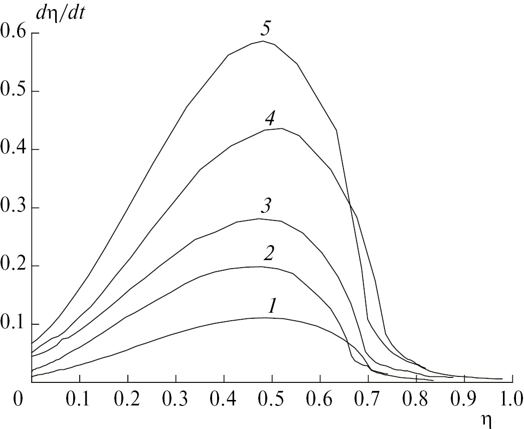 Рис. 5. Зависимость скорости реакции термического разложения Az(O)CH3 от глубины разложения при различных температурах: 1 – 220.2, 2 – 231.4, 3 – 234.8, 4 – 240.2, 5 – 245.2 °C.