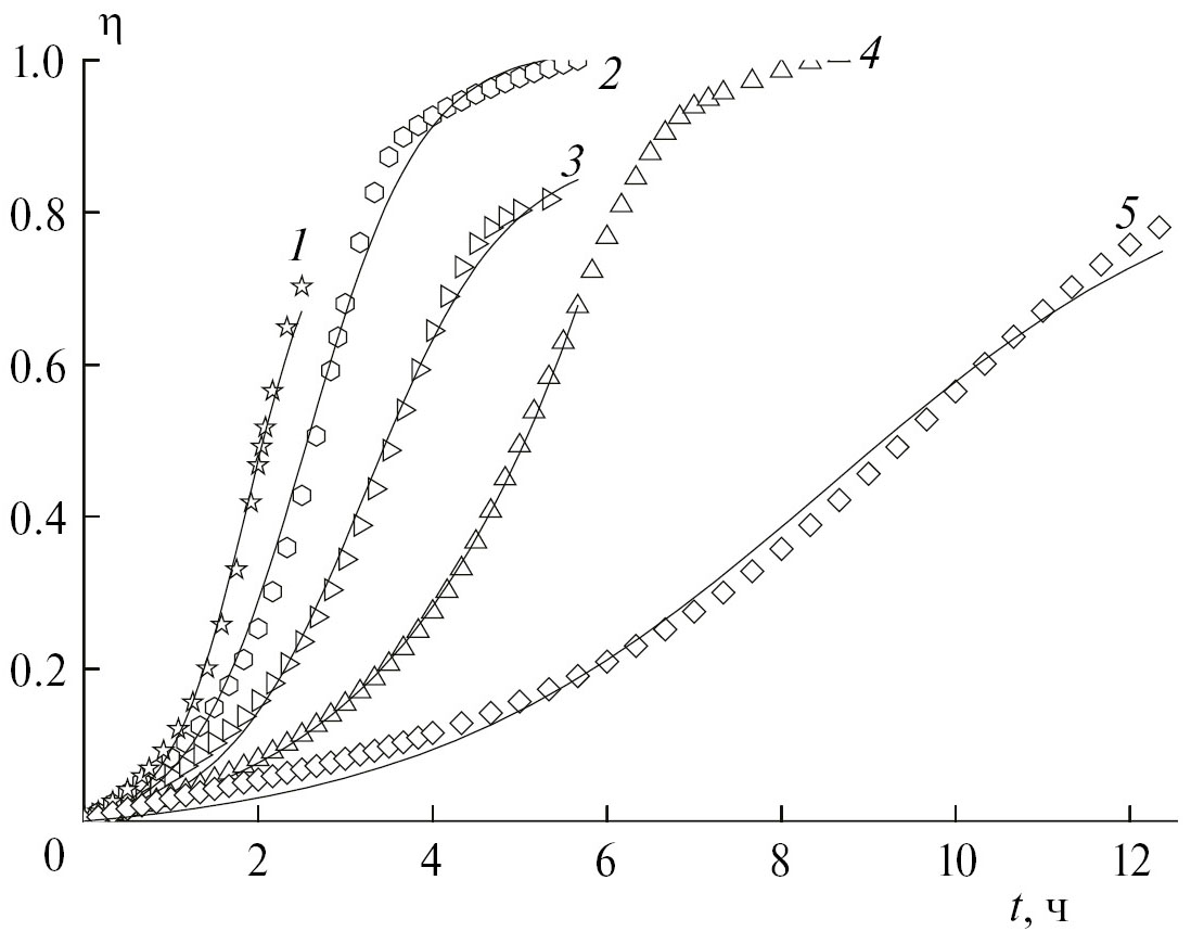 Рис. 6. Кинетические кривые зависимости глубины разложения Az(O)CH3 от времени при различных температурах: 1 – 245.2, 2 – 240.2, 3 – 234.8, 4 – 231.4, 5 – 215.2 °C. Точки – эксперимент, сплошные кривые – расчет по уравнению (2).
