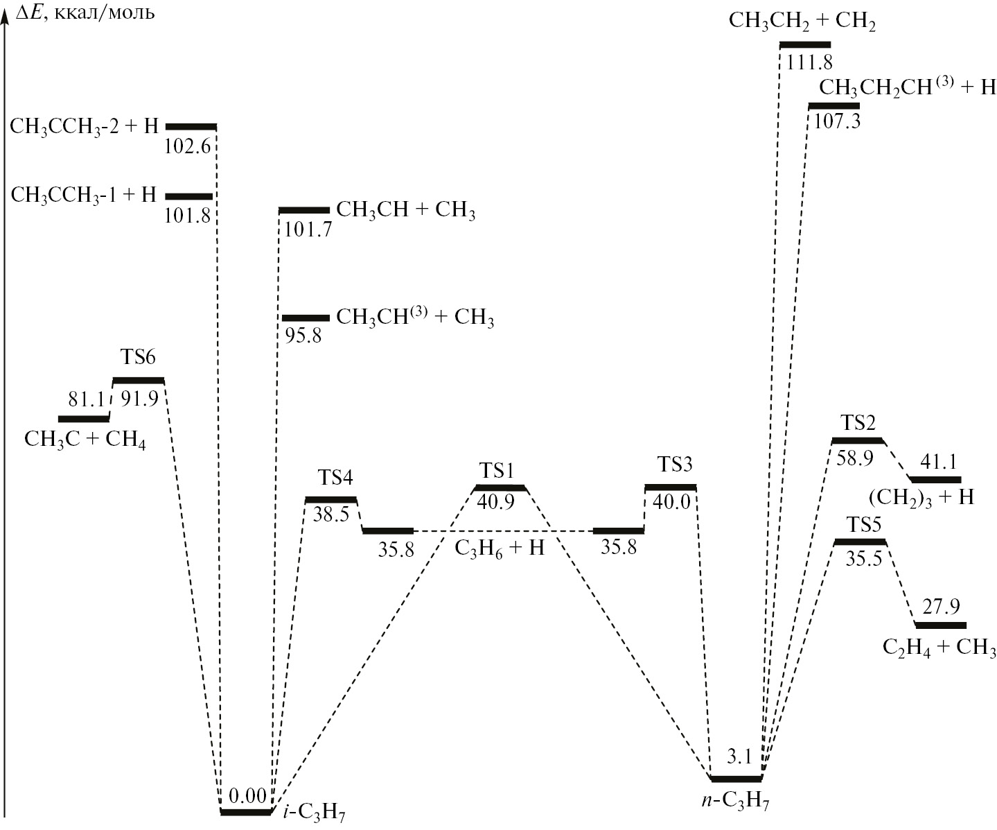 На рис. 1 приведена энергетическая диаграмма полной энергии интермедиатов относительно энергетического уровня радикала i-C3H7, рассчитанная методом M062X/6-311+G(2d,p). Как видно из этого рисунка, отсутствуют переходные состояния в каналах реакций образования CH3CCH3, CH3CH + CH3, CH3CH2 + CH2, CH3CH2CH + H. Переходные состояния для этих реакций нами не были обнаружены, а сканирование ППЭ по сечению указанных реакций показало монотонный рост энергии и отсутствие максимума. Можно предположить, что обратные реакции протекают без барьера.