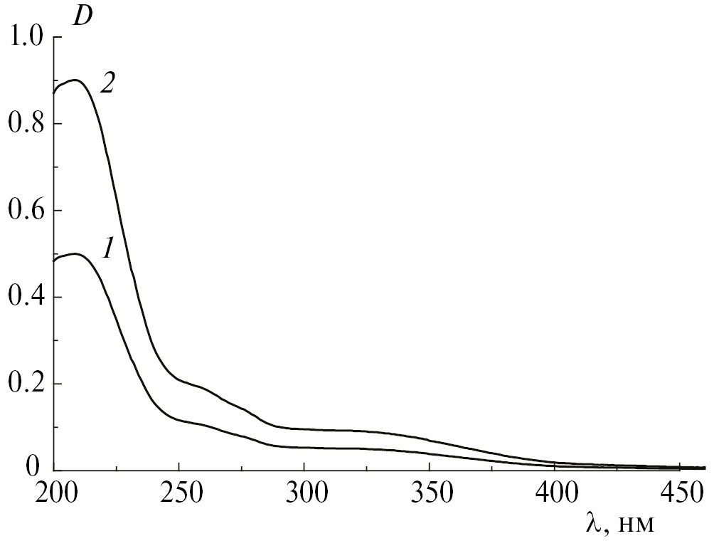 Рис. 1. Электронные спектры поглощения метаболитов, вышедших в водную среду при замачивании в течение 20 мин семян ели для контрольной группы (1) и и для опытной группы с облучением в течение 90 с (2).