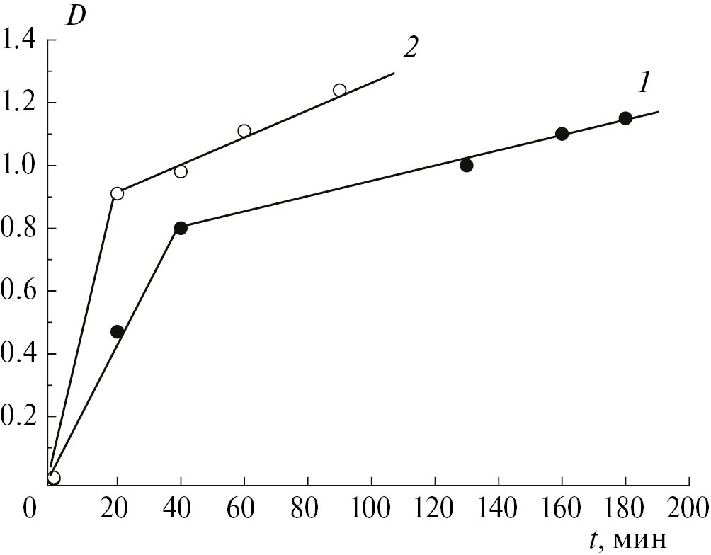 Измеряемая величина оптической плотности (D) в максимуме поглощения при 210 нм в контроле и опытах может рассматриваться как показатель интенсивности жизнедеятельности семян в водной среде на самых ранних стадиях прорастания. На рис. 2 представлены кинетические кривые выхода метаболитов во времени (D–t, мин) при замачивании семян ели для контрольных (кривая 1) и опытных групп, где использовали облучение лазером в течение 90 с (кривая 2).