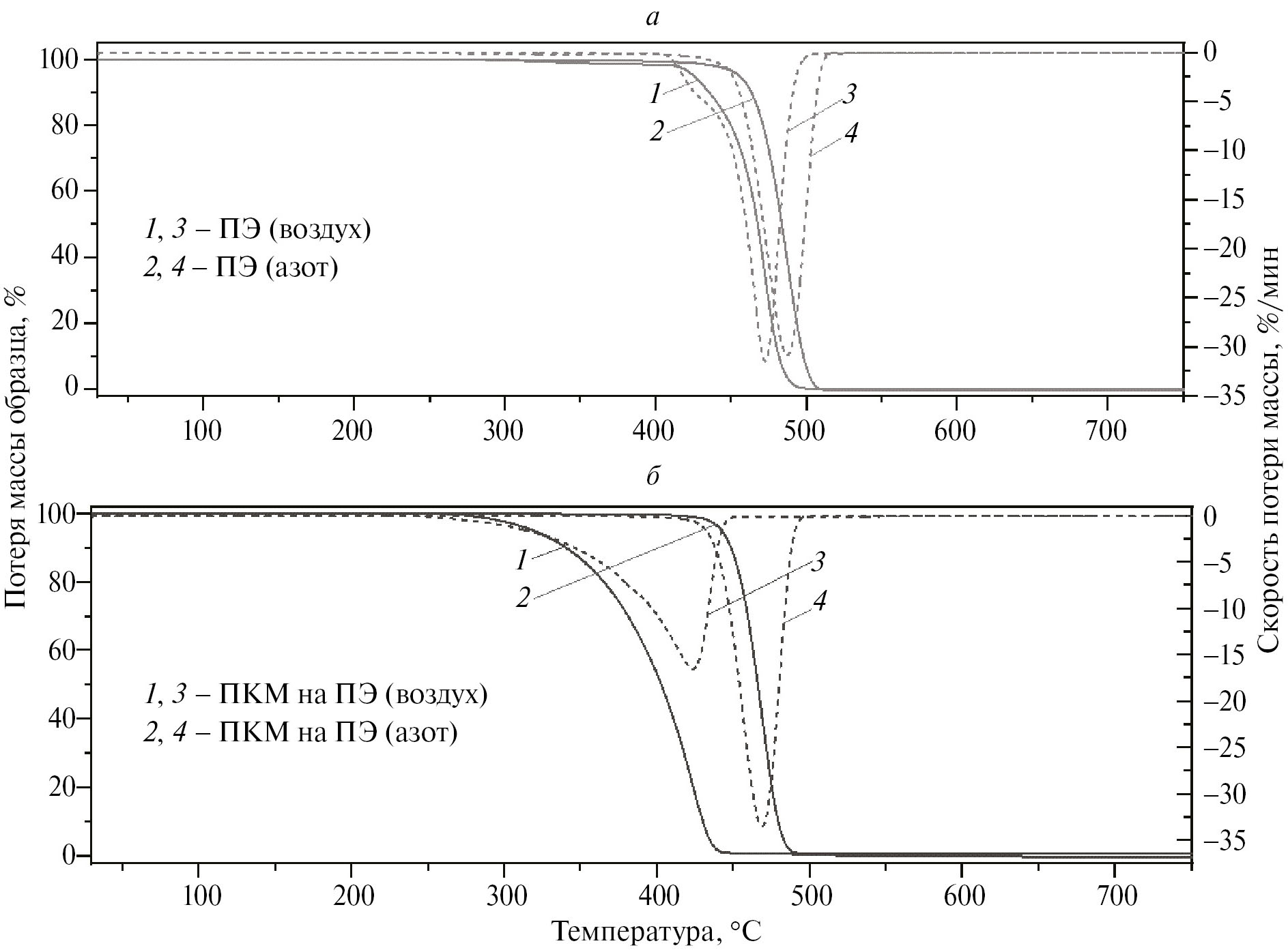 Рис. 1. Результаты ТГА (сплошные кривые) и ДТГ (штриховые) в воздухе и в азоте для образцов ПЭ (а) и ПКМ ПЭ (б).