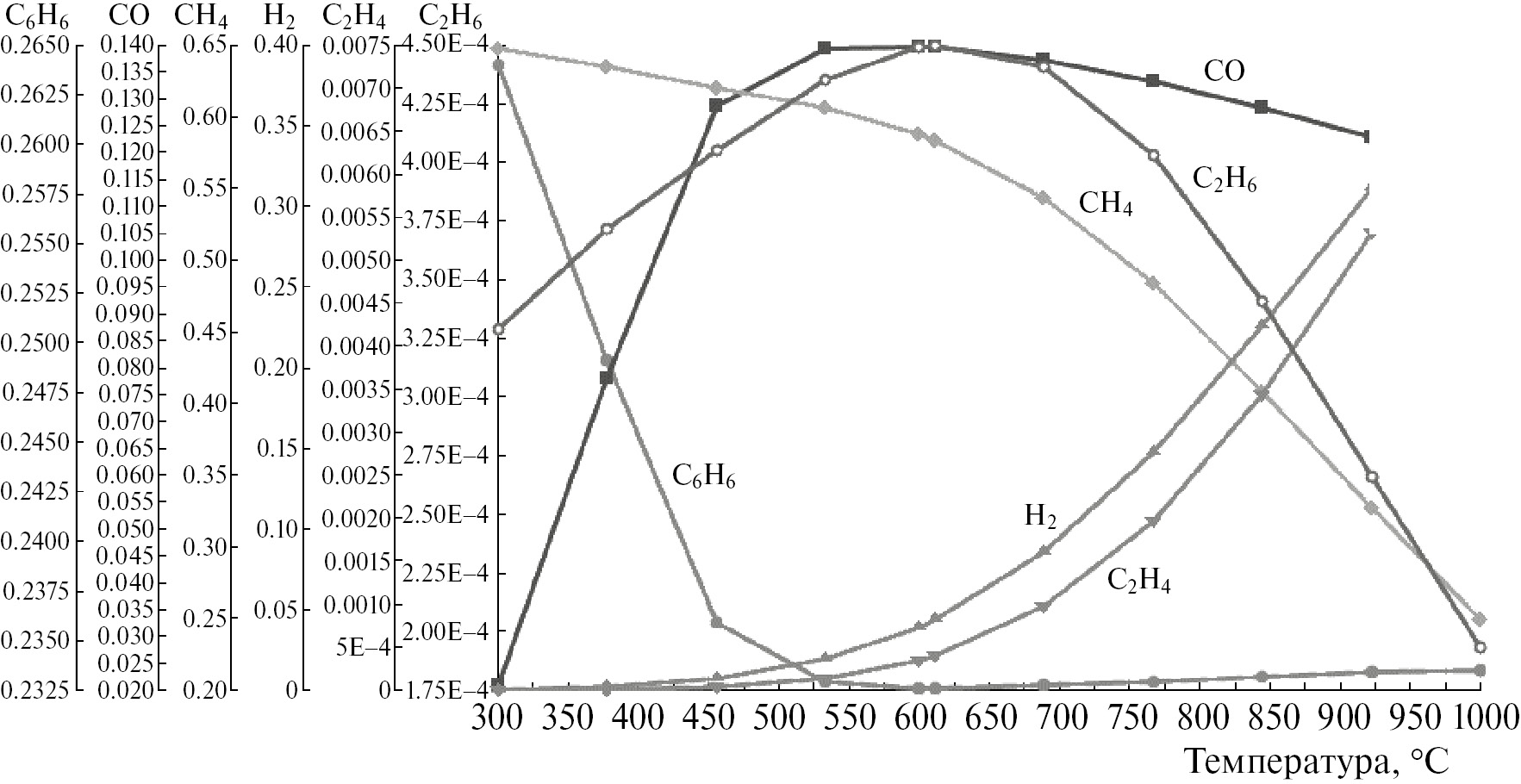 Рис. 5. Объемные доли компонентов пиролизного газа при разложении полиэтилена в зависимости от температуры в реакторе пиролиза при атмосферном давлении.