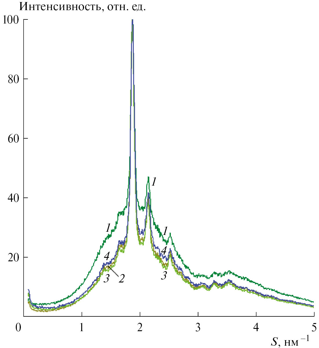 Рис. 4. Дифрактограммы пленочных композиций ПЛА/НК с содержанием НК 0 (1), 5 (2), 10 (3) и 15 (4) мас. %. Измерение на просвет.