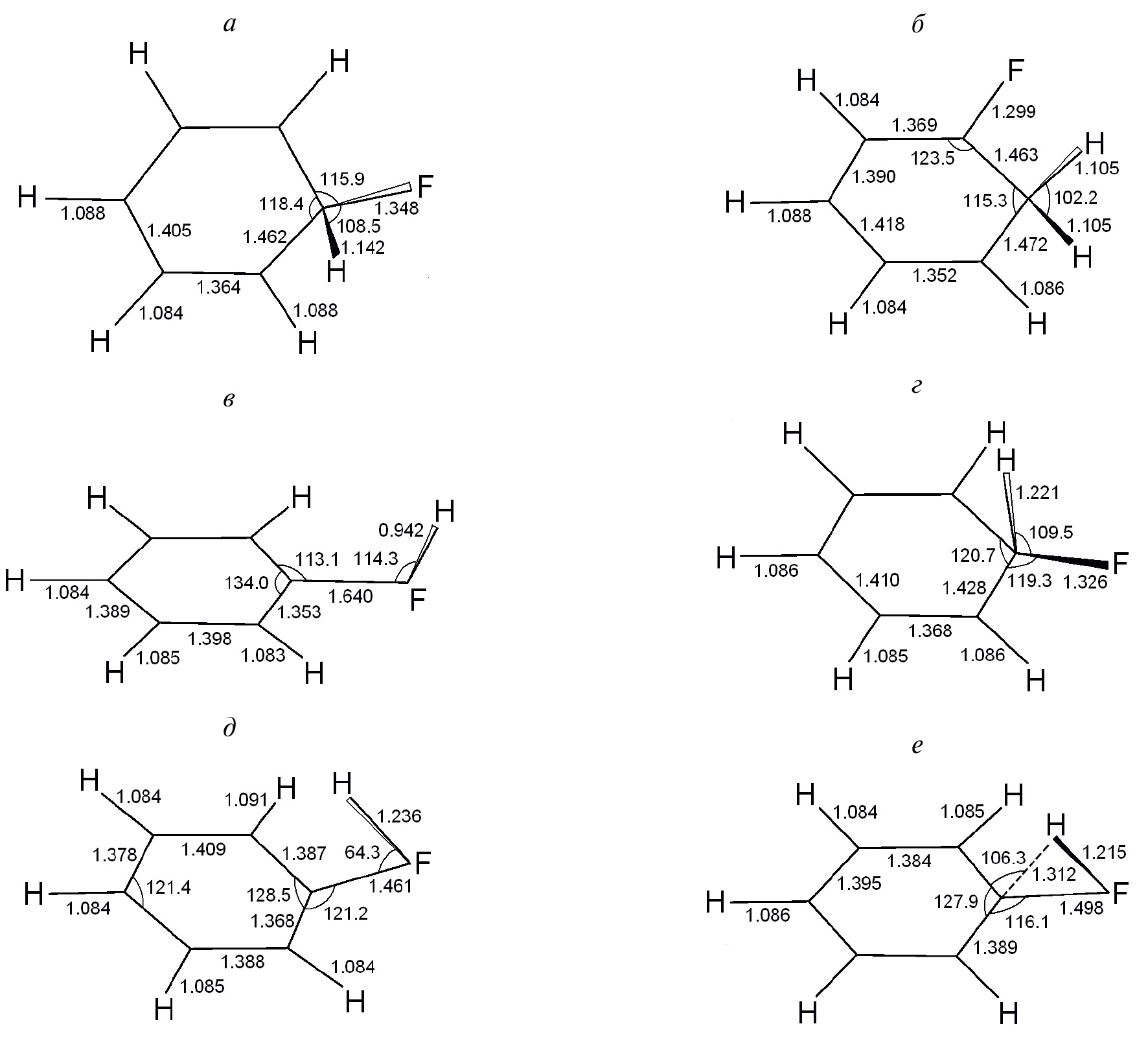 Рис. 2. Структурные модели катионов ипсо- (а), орто- (б), F-изомера (в) фторциклогексадиенил-радикалов и переходных комплексов TSoi (г), TSoF (д) и TSiF (е). Индексы в обозначениях переходных комплексов соответствуют номенклатуре изомеров: o – орто-, i – ипсо-, F-изомеров. Межъядерные расстояния приведены в ангстремах, углы – в градусах.