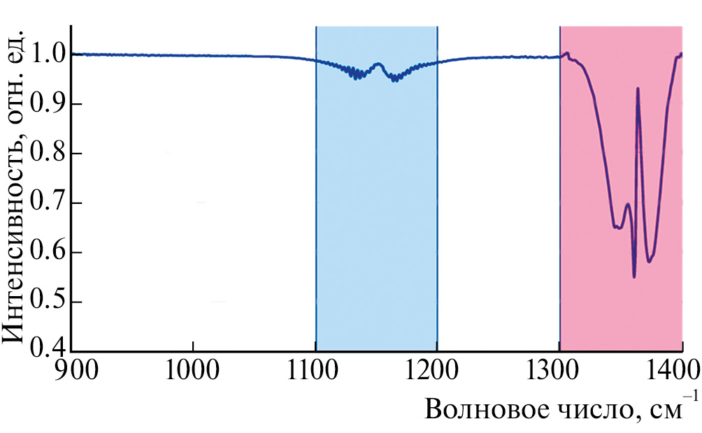 Эталонный спектр, представленный на рис. 3, был зарегистрирован ИК-фурье-спектрометром, оснащенным многоходовой кюветой типа Уайта с длиной оптического пути 6 м [37]. Эти данные соответствуют интегральной концентрации, равной 834 мг/м².