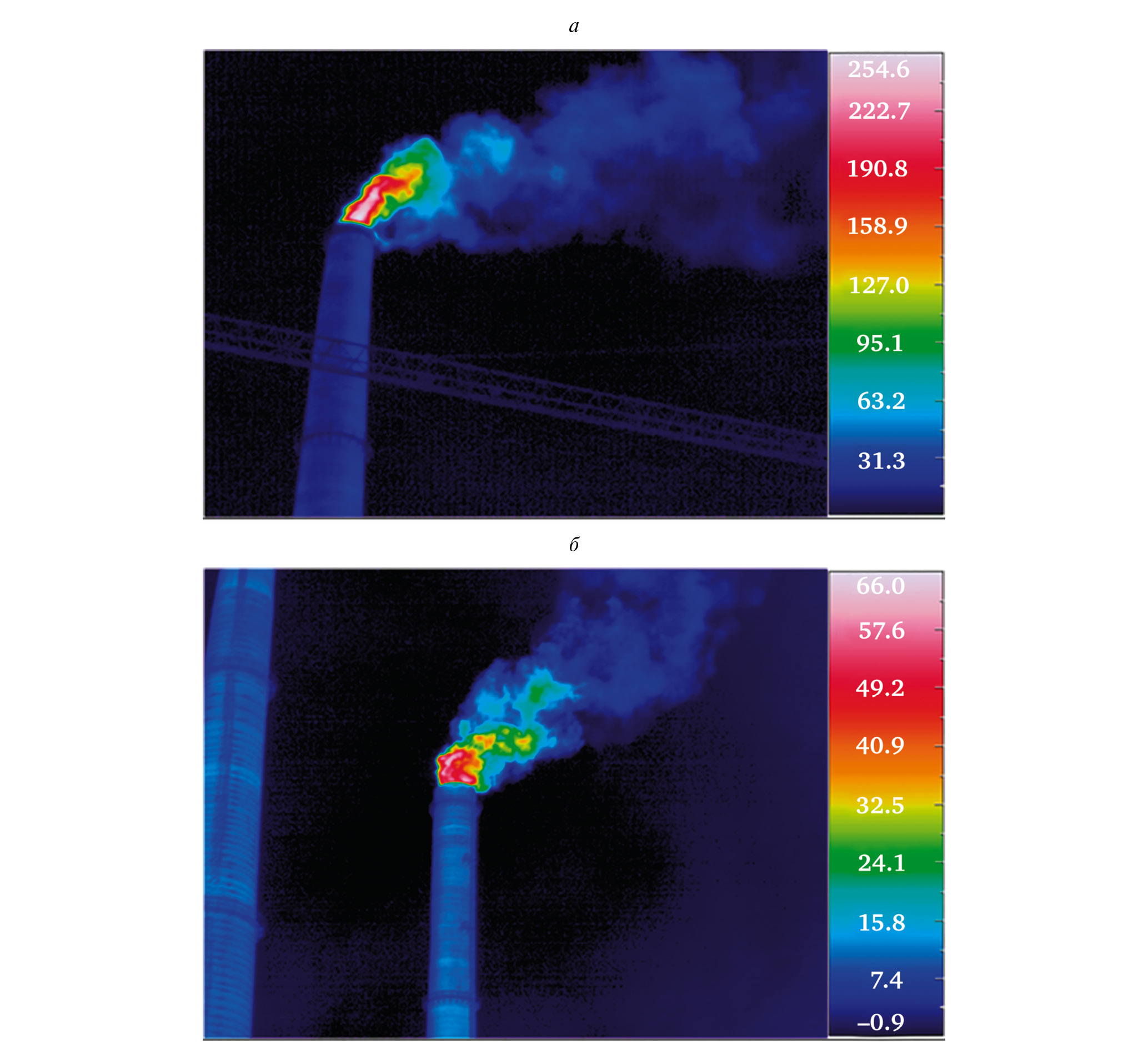 Рис. 4. Термограммы выбросов дымовых труб Медного завода Заполярного филиала ГМК “Норильский никель”: а – ДТ № 1, б – ДТ № 2. Измерения проведены 10.07.2023.