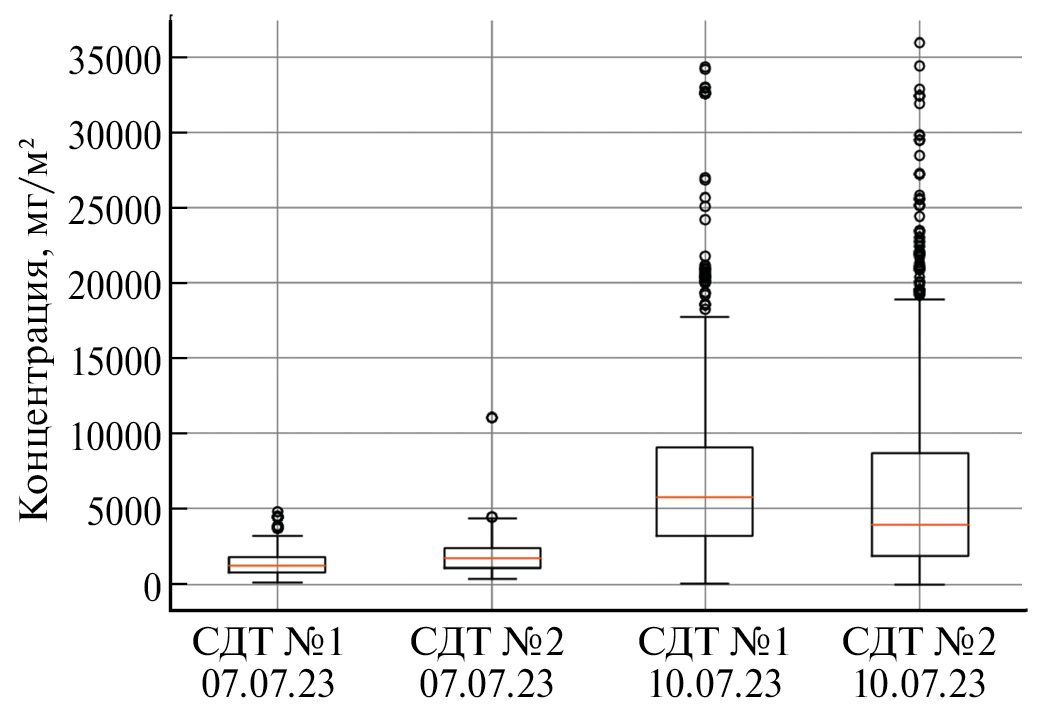 На рис. 5 представлены блочные диаграммы распределения значений интегральных концентраций SO₂, полученных дистанционно на срезах дымовых труб (СДТ № 1 и СДТ № 2). В табл. 2 для каждой серии измерений указаны расстояния от местоположения ФСР-1 до СДТ, значения медианы, 1-го и 3-го квартилей распределений интегральных концентраций SO₂, а также оценка значений температурного контраста. Разность в значениях интегральных концентраций отходящих газов ДТ, показанных на рис. 5 и в табл. 2, объясняется различной толщиной поглощающего слоя для представленных серий измерений.