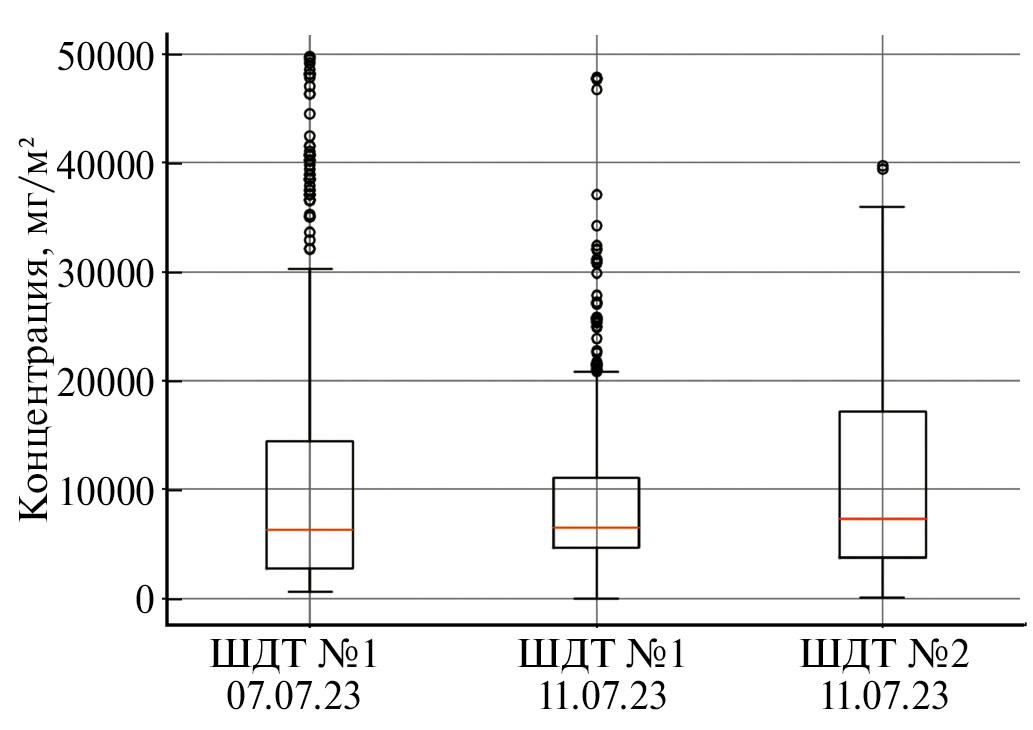 Блочные диаграммы с ограничителями выбросов для значений интегральных концентраций SO₂, полученных дистанционно на шлейфах ДТ (ШДТ № 1 и ШДТ № 2) приведены на рис. 6.