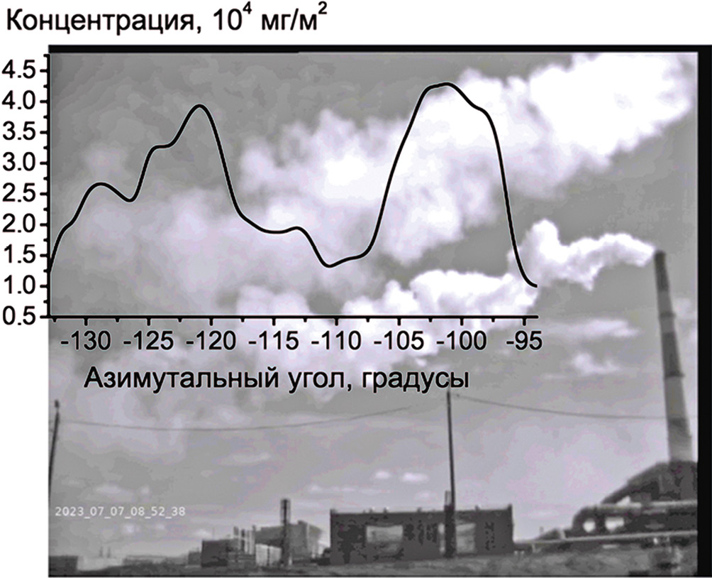 Рис. 7. Динамика интегральной концентрации SO₂, измеренная при сканировании по азимуту с углом в 40° в отходящих газах от двух ДТ Медного завода Заполярного филиала ГМК “Норильский никель”. Измерения проведены 07.07.2023.