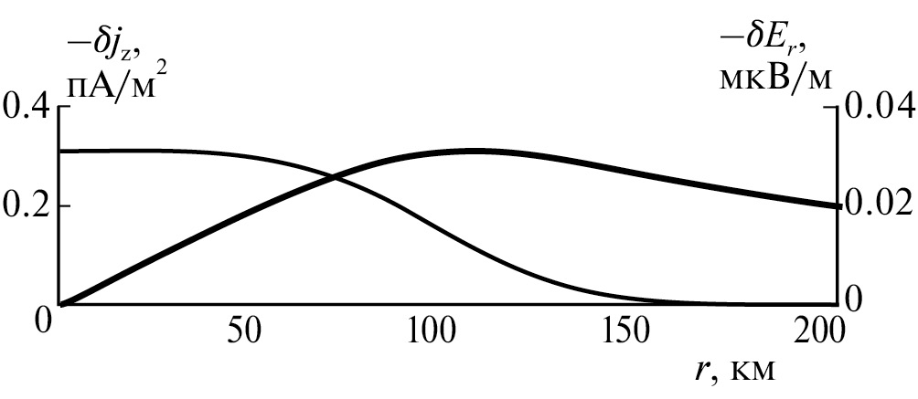 Рис. 3. Возмущения плотности тока, втекающего из атмосферы в ионосферу, δjz(r) (тонкая кривая) и радиальной компоненты ионосферного электрического поля δEr(r) (жирная кривая) при уменьшении проводимости в приземном слое воздуха.