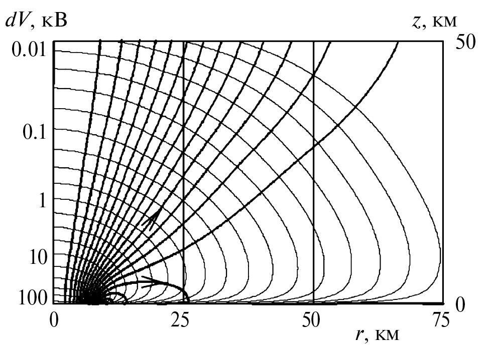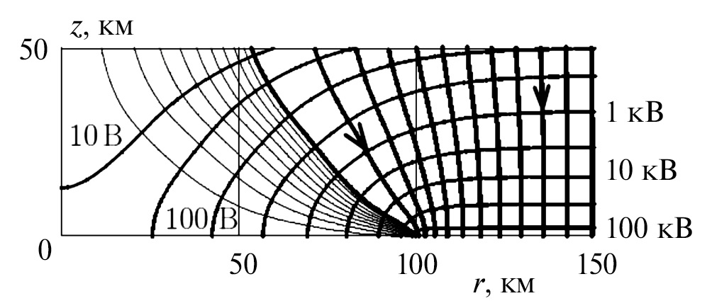 Поскольку в рассматриваемой области значения потенциала изменяются на много порядков, эквипотенциали построены с постоянным шагом в логарифмическом масштабе, а значения потенциала приведены около каждой второй эквипотенциали. Линии тока показаны жирными кривыми. Их начальные точки на высоте 60 км выбраны так, чтобы были одинаковыми токи, протекающие между соседними линиями, т.е. чтобы выполнялось условие
