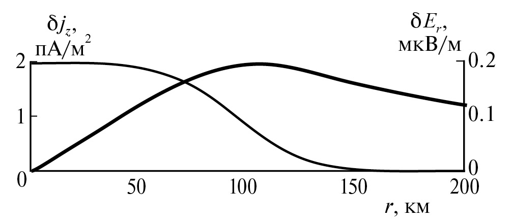 Из рис. 3 видно, что возмущение напряженности ионосферного электрического поля δEr(r) достигает максимума на окружности радиуса около 100 км, и при r > 200 км стремится к нулю примерно как 1/r. Простые оценки получаются, если приближенно представить токи, показанные на рис. 2, как однородный ток j0 = 2 пА/м², протекающий внутри цилиндра радиуса r0 при отсутствии токов вне этого цилиндра.