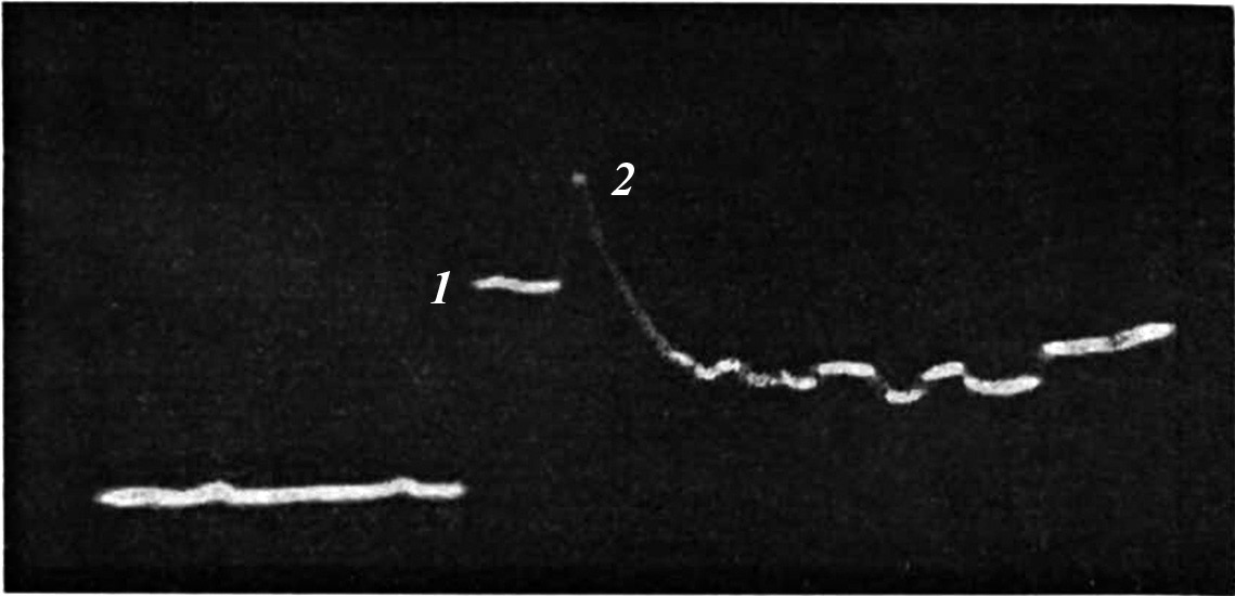 - электромагнитным датчиком зарегистрирован двухволновой профиль массовой скорости (рис. 1). Вторая волна имеет резкий передний фронт, распространяется в сжатом ЖВВ с высокой скоростью и догоняет ударный фронт.