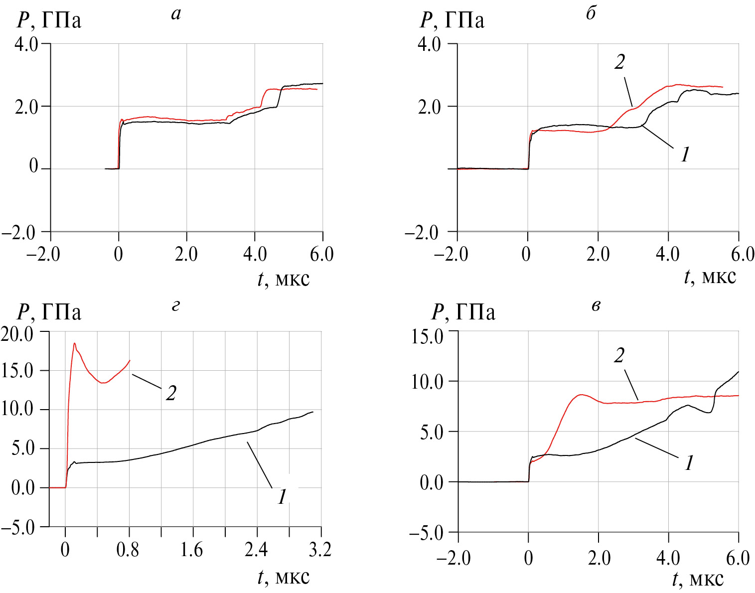 Как следует из рис. 2, профили зависимостей давления от времени, зарегистрированные входными датчиками, представляют собой часть начальной ступеньки с последующим плавным нарастанием давления. Длительность ступеньки уменьшается с ростом давления во фронте нагружающей УВ. Выходными датчиками при рИУВ < 3.2 ГПа (рис. 2б, в) зарегистрированы импульсы давления с двухволновой структурой. Длительность фронта второй волны при рИУВ = 2.6 ГПа составляет ~1 мкс, волна движется в направлении ударного фронта нагружающей УВ со скоростью, большей скорости фронта. При рИУВ = 3.2 ГПа (рис. 2г) наблюдается догон второй волной ударного фронта и формирование волны с фронтом малой длительности (~0.1 мкс).