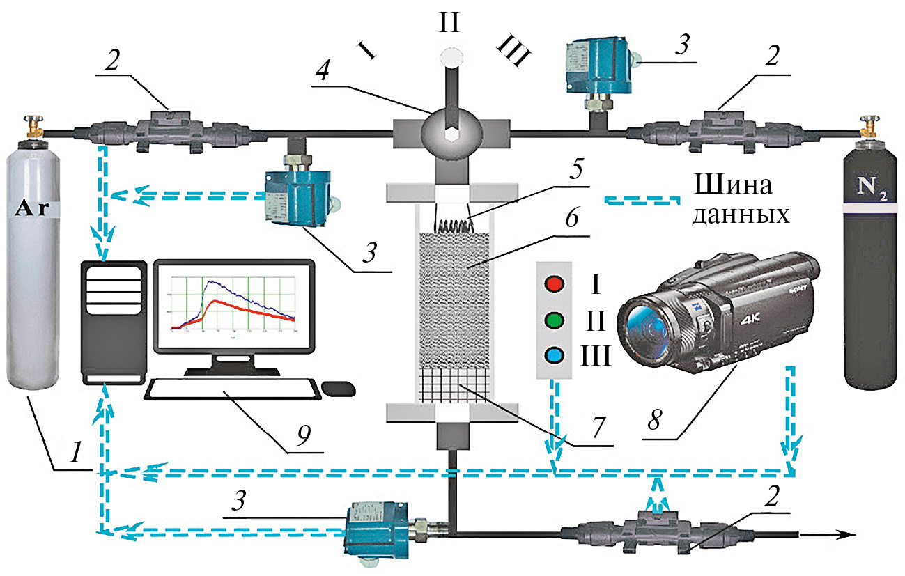 Эксперименты проводили по следующей схеме: исследуемая смесь 6 засыпалась в вертикально установленную прозрачную кварцевую трубку (внешний диаметр – 19 мм, высота – 90 мм, толщина стенок – 2 мм) на подложку 7 из минеральной ваты (основа – Al2O3). Сигналы от датчиков 2, 3 и светодиодов, информирующих о положении переключателя подачи газа 4, через АЦП в режиме реального времени поступали в компьютер 9. Тепловой импульс от вольфрамовой спирали 5 запускал процесс горения с верхнего торца образца. В отдельных экспериментах, для исключения влияния конвективного теплопереноса примесными газами и продуктами разложения ПВБ на скорость горения, гранулированную шихту помещали внутрь цилиндра из металлической сетки, обеспечивающего зазор ~1.5 мм между стенками кварцевой трубки и шихтой для отвода примесных газов в зазор. Перед каждым экспериментом образец продували потоком аргона при перепаде давления 1 атм для исключения усадки несгоревшей части засыпки в процессе горения и получения стабильных результатов. Высота засыпки исходной смеси (как порошковой, так и гранулированной) после продува была равна (40±5) мм. Процесс горения записывался с помощью цифровой видеокамеры 8 FDR AX700 производства ком пании Sony (Japan) (скорость съемки 100–250 кадров/с). На основании покадровой обработки видеозаписей рассчитывалась скорость фронта горения.