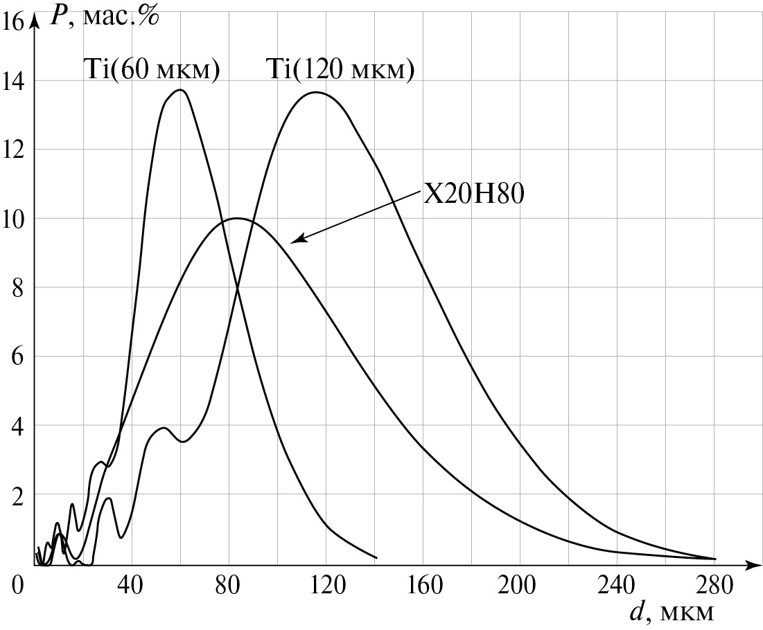На рис. 2 показано распределение частиц исходных металлических компонентов по размерам в процентах к общей массе исследуемого порошка. При расчетах необходимых и достаточных условий прогрева частиц компонентов порошковых смесей в качестве характерных размеров использованы их значения в точке максимума функции распределения: d(Ti) = 60 и 120 мкм, d(NiCr) = 90 мкм. Внешний вид частиц титана с d(Ti) = 60 и 120 мкм, полученный с использованием СЭМ, приведен на рис. 3.