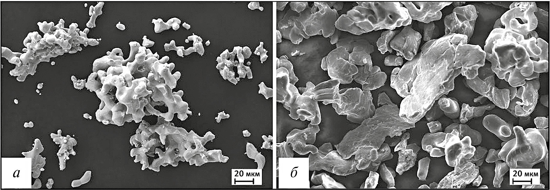 Рис. 3. Внешний вид частиц титана с d(Ti) = 60 мкм (а) и d(Ti) = 120 мкм (б).