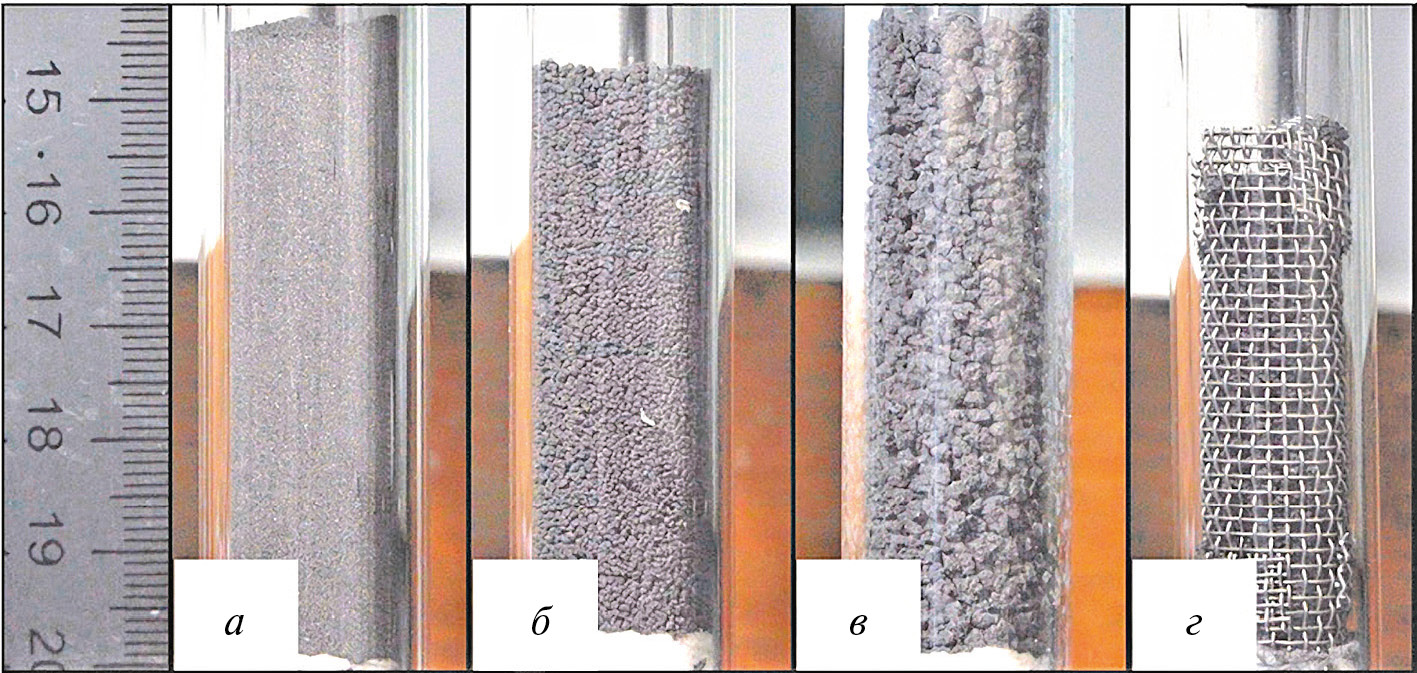 Рис. 4. Фотографии порошковой (а) и гранулированной шихты с гранулами размера D = 0.6 мм (б) и D = 1.7 мм (в) в кварцевом реакторе и цилиндра (г) из металлической сетки с гранулированной шихтой.
