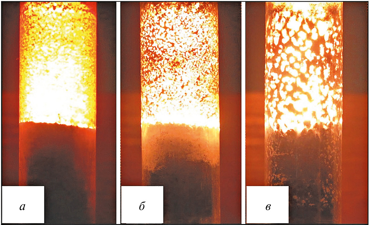 Горение всех исследованных смесей (100 − X)×(Ti + C) + XNiCr, X = 0−30%, как порошковых, так и гранулированных, происходило в стационарном режиме. Форма фронта горения плоская, что позволяло проводить надежное измерение положения фронта горения в разные моменты времени и определять скорость его распространения. На рис. 5 приведены кадры горения. Используемые в расчетах значения скоростей горения являются средними по 3–4 экспериментам, разброс значений составляет не более 10%.