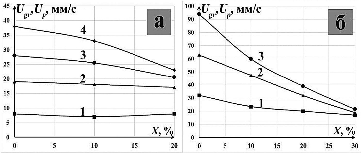 8. Fig. 7. Dependences of the combustion rate of Ti + C mixtures with d(Ti) = 120 (a) and 60 μm (b) on the nichrome content X: 1 – powder mixture, 2 – granulated mixture with D = 0.6 mm, 3 – granulated mixture with D = 1.7 mm, 4 – combustion rate of the granule substance.
