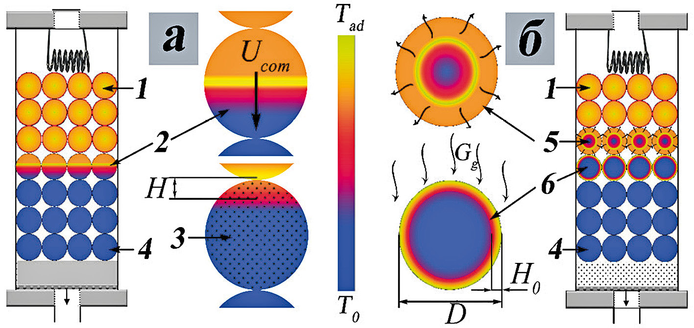 9. Fig. 8. Scheme of combustion of granulated mixtures; a – conductive mode: 1 – burnt granules, 2 – combustion of granule in conductive mode, 3 – start of heating of next granule, 4 – initial granules, H – depth of conductive heating by the moment of ignition, Ucom – combustion rate of granule substance; b – convective mode: 1 – burnt granules, 5 – combustion of granule, 6 – start of combustion of next layer, 4 – initial granules, D – granule size, H0 – depth of convective heating of granule by the moment of ignition by gas flow Gg.