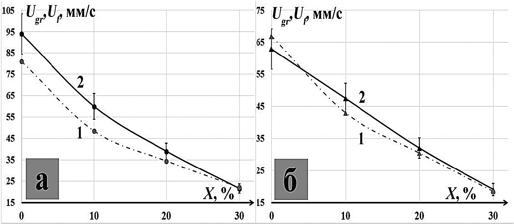 10. Fig. 9. Dependences of combustion rates Uf (1) and Ugr (2) on the nichrome content X: D = 1.7 (a) and 0.6 mm (b).