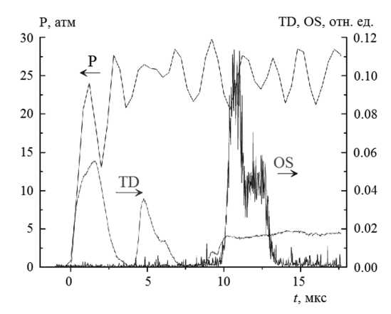 Рис. 4. Показания P, TD и OS, свидетельствующие о воспламенении смеси при T = 2457 K и p = 20.6 атм.