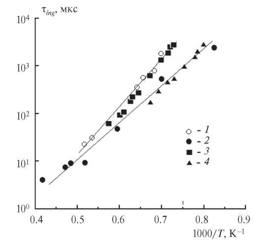 Рис. 5. Времена задержки воспламенения в стехиометрической смеси C3H6/O2/Ar, измеренные в настоящей работе при p = 4.5–6.0 атм (1) и p = 12–25 атм (2), в сравнении с экспериментальными данными из [11], полученными при p = 4.5 атм (3), и из [20], полученными при p = 15 атм (4). Линии – аппроксимационные кривые.