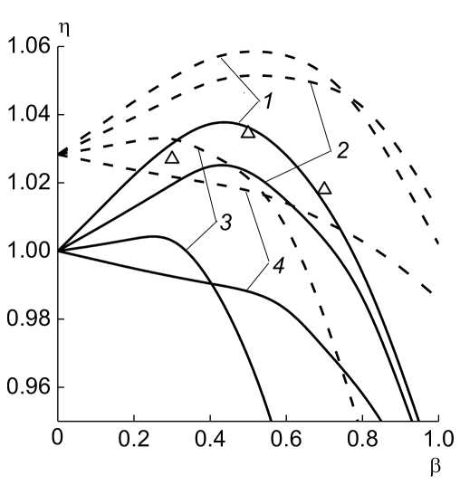 Рис. 1. Относительная скорость пластины (h) в зависимости от массовой доли ВВ-окислителя в бинарной композиции с октогеном (b); сплошные линии – бинарные смеси, штриховые – составы с добавкой 12.5% Al. ВВ-окислители: 1 – БТНЭН, 2 – ГНФ, 3 – АДНА, 4 – ДНГ. Символы – экспериментальные значения для состава БТНЭН/октоген.