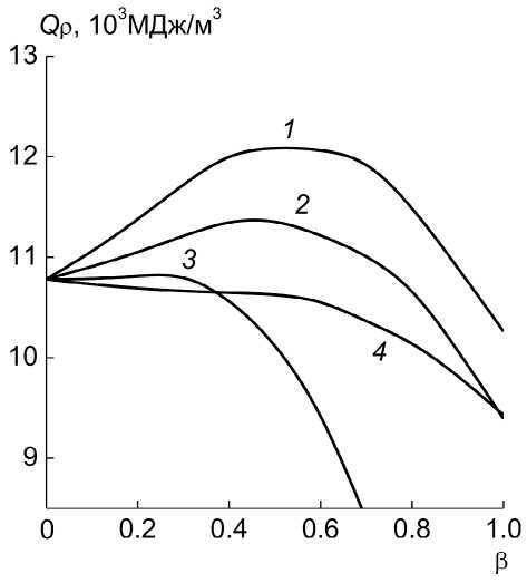 В экспериментах по методике М-40 объем заряда остается постоянным. С учетом этого в качестве важного параметра, влияющего на МС взрывчатого материала, следует рассматривать запас энергии в единице объема. На рис. 2 представлены расчетные зависимости, отражающие влияние концентрации ВВ-окислителя на объемные значения ТВ бинарных композиций с октогеном. Сравнение указывает на соответствие кривых на рис. 1 и 2.