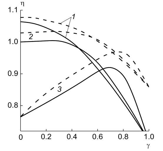 Рис. 3. Относительная скорость пластины (h) в зависимости от массовой доли вещества АДНА в бинарной композиции с ВВ (g); ВВ: 1 – CL-20, 2 – октоген, 3 – ТНТ; сплошные линии – бинарные смеси, штриховые – составы с добавкой 12.5% Al.