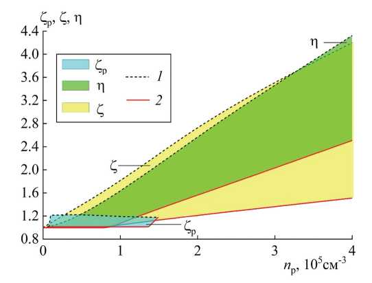 Для одной микрочастицы выражение (1) описывает эффективное накопление ионов в облаке при условии [⟨ni(rc,np)⟩ − ⟨ni(rc,0)⟩] > np, когда приращение концентрации ионов, обусловленное присутствием микрочастиц в разряде, превышает концентрацию микрочастиц, что выполняется при zp > 1. Очевидно, что эффективные состояния накопления ионов облаком аналогично реализуются при z ≥ 1 и η ≥ 1. Поэтому приведенные на рис. 2 домены показаны ограниченными данными условиями.