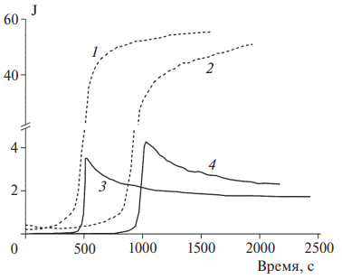 Рис. 1. Кинетика интенсивности (J) хемилюминесценции при инициированном окислении подсолнечного масла в присутствии хелата европия (1, 2) и без него (3, 4). Концентрация масла – 2% (1, 3) и 4% (2, 4) по объему.