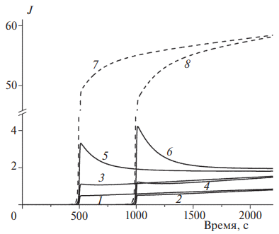 Рис. 3. Модельные кинетические кривые интенсивности (J) хемилюминесценции в присутствии хелата европия (7, 8) и без него (1–6) при инициированном окислении 2%-ного (1, 3, 5, 7) и 4%-ного (2, 4, 6, 8) растворов растительного масла в хлорбензоле и квантовых выходах ηi (в отн. ед.) реакций (16), (17), (18), (19), (20), (23), соотносящихся как: 31 : 4 : 4 : 4 : 4 : : 2.1 · 104 (1, 2); 135 : 7 : 7 : 7 : 7 : 3.3·104 (3, 4); 1000 : 1 : 1 : : 1 : 1: 0.5 · 104 (5, 6); 500 : 500 : 250 : 850 : 50 : 25 · 104 (7, 8).
