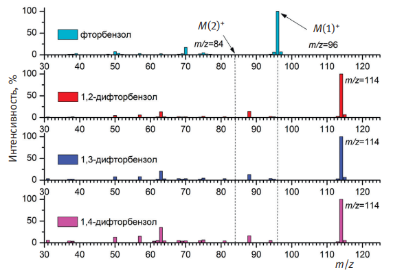 Атомы F получали в высокочастотном разряде смеси F2 и He (избыток He был более 99%). Разрядная кварцевая трубка помещалась на расстоянии 40 см от напускного отверстия масс-спектрометра. Внутри разрядной трубки находилась керамическая вставка из синтетического сапфира (Al2O3), которая служила для снижения образования атомов кислорода при реакции атомов фтора с материалом разрядной трубки. Бензол (фторбензол, хлорбензол) и циклогексан поступали в реактор из объемных стеклянных колб, в которых они хранились в виде смеси с гелием при давлении 0.5–0.9 бар, и после тонкой регулировки газовых потоков игольчатыми вентилями вещества смешивались уже при низком давлении в области входа трубки-инжектора в реактор. Регулировка и стабилизация потока газа-разбавителя осуществлялись с помощью расходомера Mass Flow Controller 1100 Series (Type 1160 B) производства компании FUJIKIN(Japan). Давление в реакторе измерялось мембранным манометром Baratron (Type 122A) производства компании MKS (Germany).