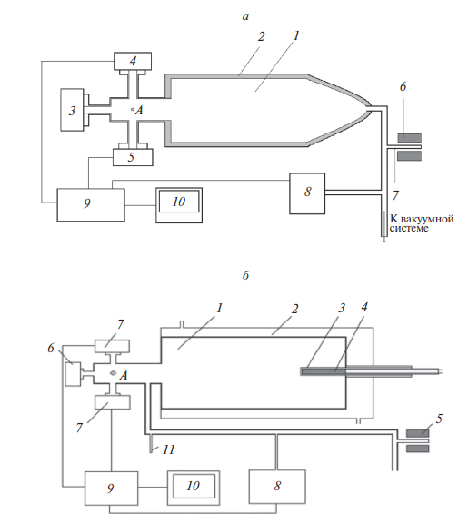 Рис. 1. а ‒ Установка для измерения вероятности гетерогенной рекомбинации атомов: 1 – кварцевый реактор с нагреваемыми стенками для температур 300–700 K; 2 – печь; 3 – источник резонансного излучения; 4–5 – приемники резонансного излучения; 6 – СВЧ-резонатор, обеспечивающий диссоциацию газа в кварцевом отростке 7, 8 – датчик давления; 9 – электронная система обработки сигналов; 10 – компьютер. б ‒ другой вариант установки 1 – кварцевый реактор с охлаждаемыми стенками; 2 – кварцевая “рубашка”; 3 ‒ исследуемый образец; 4 ‒ нагреватель; 5 – резонатор СВЧ-генератора; 6 ‒ источник резонансного излучения; 7 – приемники резонансного излучения; 8 – датчик давления; 9 – электронный блок обработки сигналов; 10 – компьютер системы регистрации; 11 ‒ кварцевый отросток реактора для вымораживания продуктов реакции. Точкой А на обоих рисунках обозначено место регистрации исследуемых атомов.